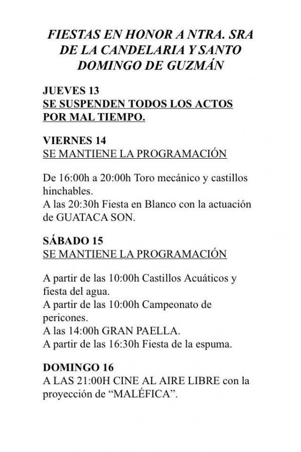 Debido al mal tiempo hoy jueves se han suspendido todos los actos festivos previstos dentro del programa  de las Fiestas en honor a la Virgen de la Candelaria y Santo Domingo de Guzmán, pero se mantienen para mañana viernes y para el fin de semana.