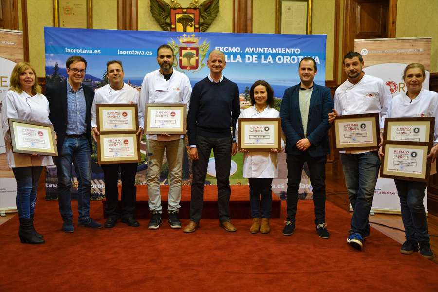 El Salón de Plenos del Ayuntamiento de La Orotava fue el escenario escogido para la entrega de los premios y diplomas a los establecimientos participantes en el Concurso-Ruta Gastronómica ‘Saborea La Orotava 2018’, así como para el reparto de obsequios del sorteo que se llevó a cabo entre los clientes que votaron a los locales concursantes. En la categoría Tapa-Montado, la tasca-venta El Gomero, con “A la mar fui por aguacates...”, se alzó con el primer premio otorgado por jurado profesional. El Bodegón El Lebrillo y Restaurante El Algarrobo, con las tapas “Salto del Pastor” y “Crema de aguacate con chutmade de verduras y chicharros”, respectivamente, se hicieron con el segundo y tercer premio. El Algarrobo también recibió el voto especial del público.