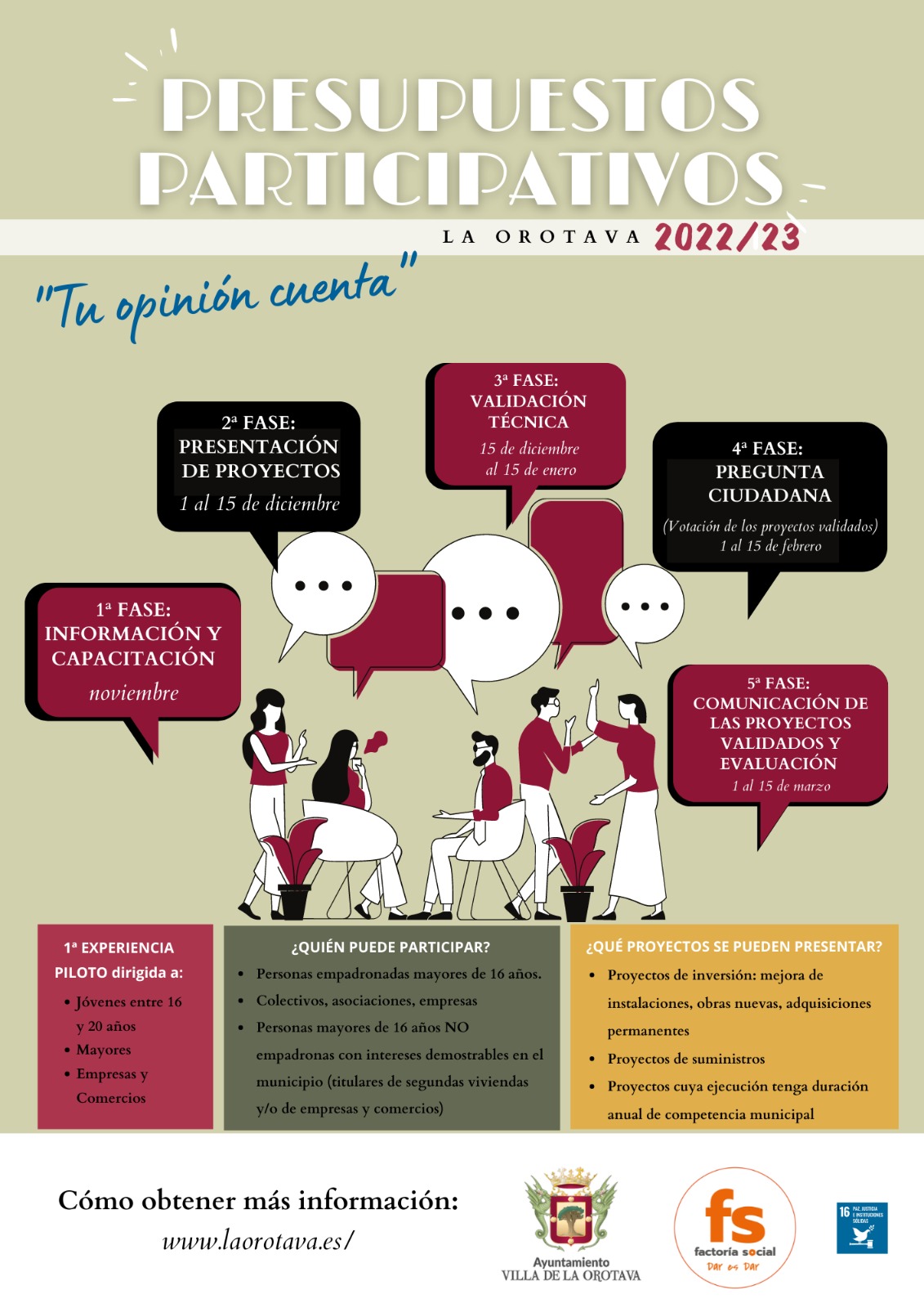 ¿Quieres formar parte de la presentación de propuestas para los presupuestos participativos 2022/2023? Participa en la asamblea que tiene lugar hoy, 14 de diciembre, a las 17:00 horas en la Casa de la Juventud. Esta iniciativa está dirigida a jóvenes, de entre 16 y 20 años, a mayores y a empresas y comercios de La Villa. Te esperamos, ¡tu opinión cuenta!