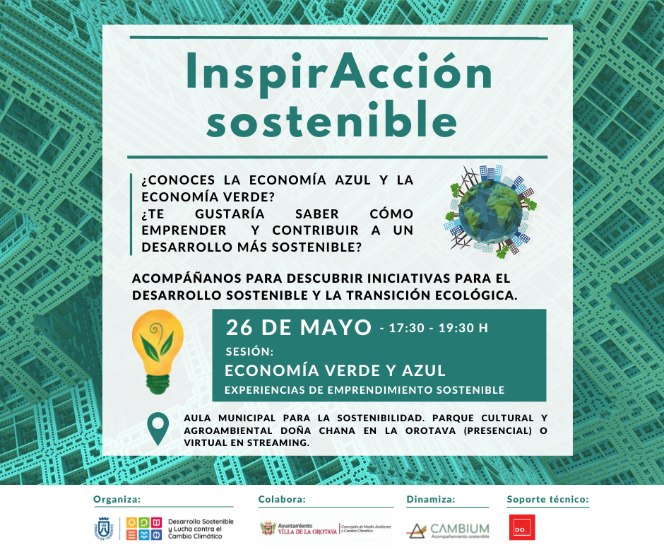 El Área de Desarrollo Sostenible y Lucha contra el Cambio Climático, en colaboración con el Ayuntamiento de La Orotava, organizan la última sesión divulgativa del Ciclo “InspirAcción Sostenible”, dedicada al emprendimiento verde y azul y sus beneficios para contribuir a un desarrollo más sostenible.