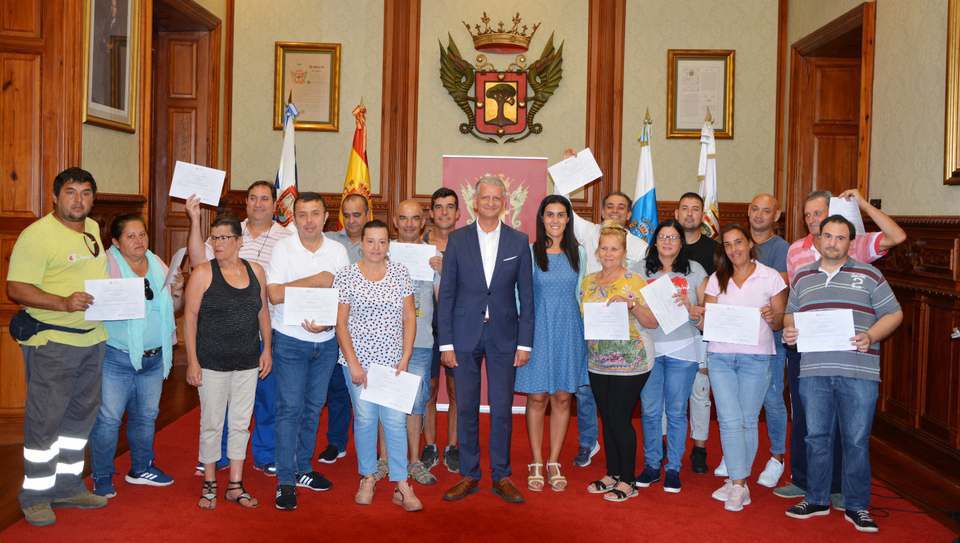 Los alumnos que han participado en el curso de Prevención de Riesgos Laborales para trabajos de jardinería y zonas verdes han recibido sus diplomas acreditativos en el Ayuntamiento de La Orotava, de la mano del alcalde Francisco Linares, y la concejala delegada del área de Formación y Empleo, Deisy Ramos.
