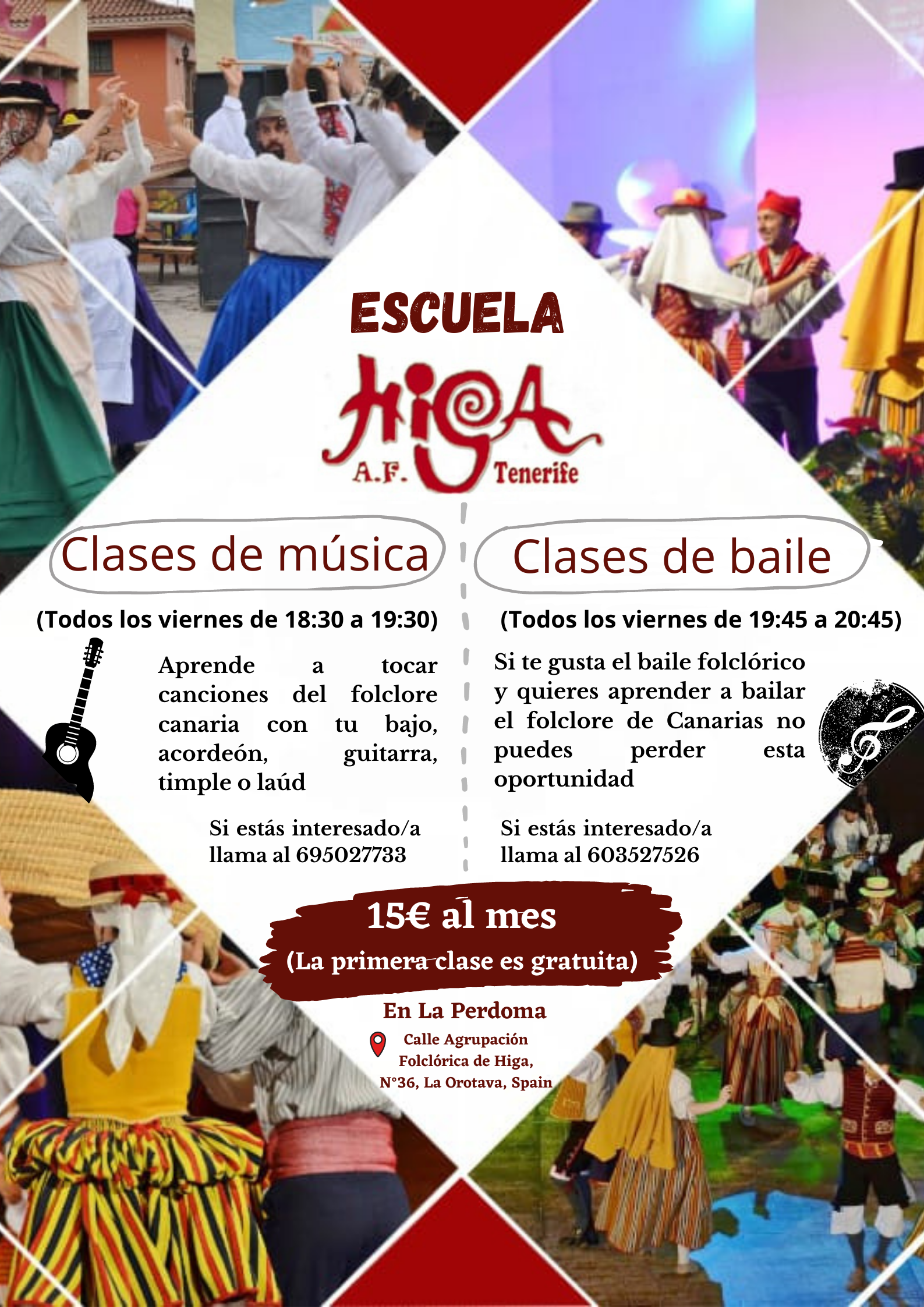 La escuela de la Agrupación Folclórica de Higa ha retomado su actividad este pasado 1 de abril y llevará a cabo una clase a la semana todos los viernes de cada mes. La escuela tiene su sede en el local de ensayo del grupo, en La Perdoma, concretamente en la Calle Agrupación Folclórica de Higa, 36.