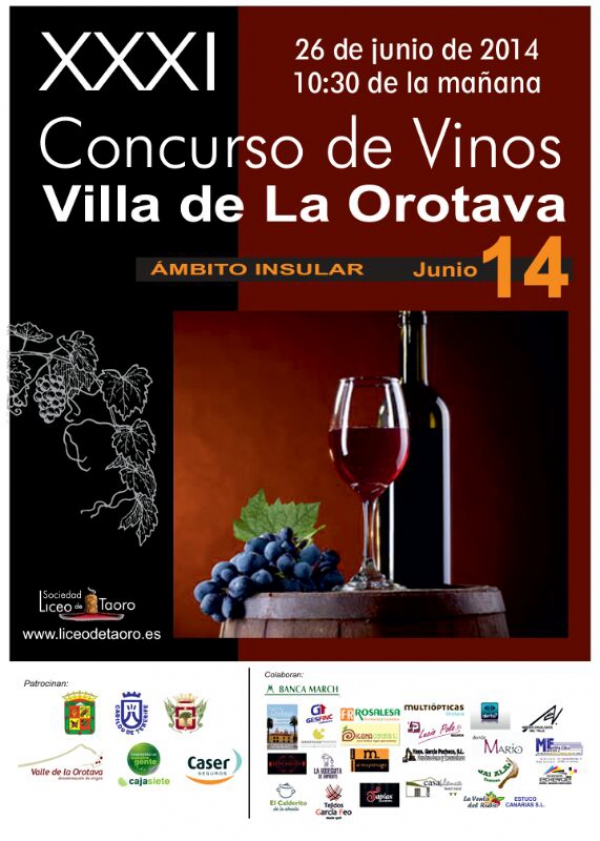 El jueves 26 de junio a partir de las 10:30 horas en el salón de actos de la Sociedad Cultural Liceo de Taoro, tendrá lugar el XXXI Concurso de Vinos Villa de La Orotava, 1ª Fase de cosecheros de la Villa de la Orotava y 2ª Fase vinos con D.O. de ámbito insular.