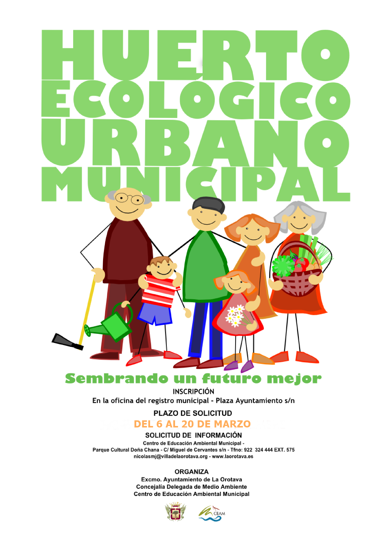 El Ayuntamiento, a través de la Concejalía de Medio Ambiente que dirige Luis Perera, abre el plazo de inscripción para participar en los Huertos Ecológicos Urbanos municipales. La solicitud deberá presentarse hasta el 20 de marzo en la oficina del Registro General.